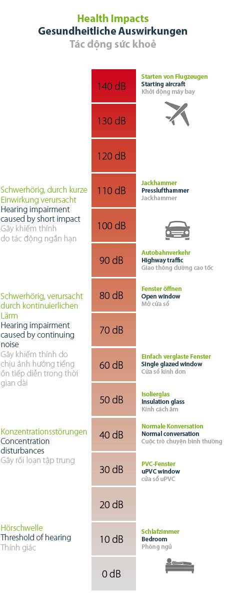 - Tiếng ồn ở mức 90 dB (xe cộ, lưu lượng giao thông dày) - 140 dB (máy bay cất cánh/ hạ cánh) có thể gây ra tình trạng khiếm tính với những tác động ngắn hạn.